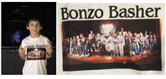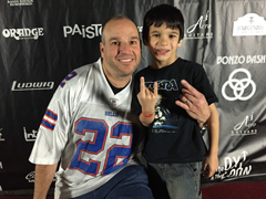 Thursday morning came and Dad was so excited we visited The Observatory OC early to make certain we knew where it was located since he didn’t want us to miss anything. We entered the parking lot and noticed the doors were open and met several nice employees who were nice enough to let us look inside. To our surprise, the stage was empty with no drums to be found. Not to be disappointed, Dad took my picture in the Bonzo Basher shirt my Mom had custom made for this special day. The picture on my shirt was taken in May 2013 at the Bonzo Bash East Coast Invasion concert at the Bergen Performing Art Center. Thank you AJ Pero for helping Scoob up on stage for the final celebration!