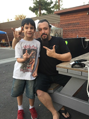 Dad woke me up and said it was 3pm and time to head over to the Bonzo Bash sound check. We didn’t know what to expect, but when we arrived we were allowed inside and discovered Brian Tichy, Brent Woods, Chas West, Michael Devin, Stephen LeBlanc and Charlie Benante jamming on stage. After sound check, everyone took time from their busy day to say hello to Scoob. An added bonus was Dad took a picture of Scoob and Charlie Benante in the parking lot.