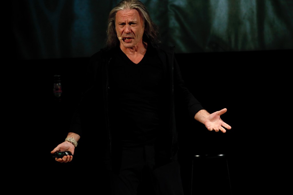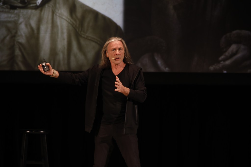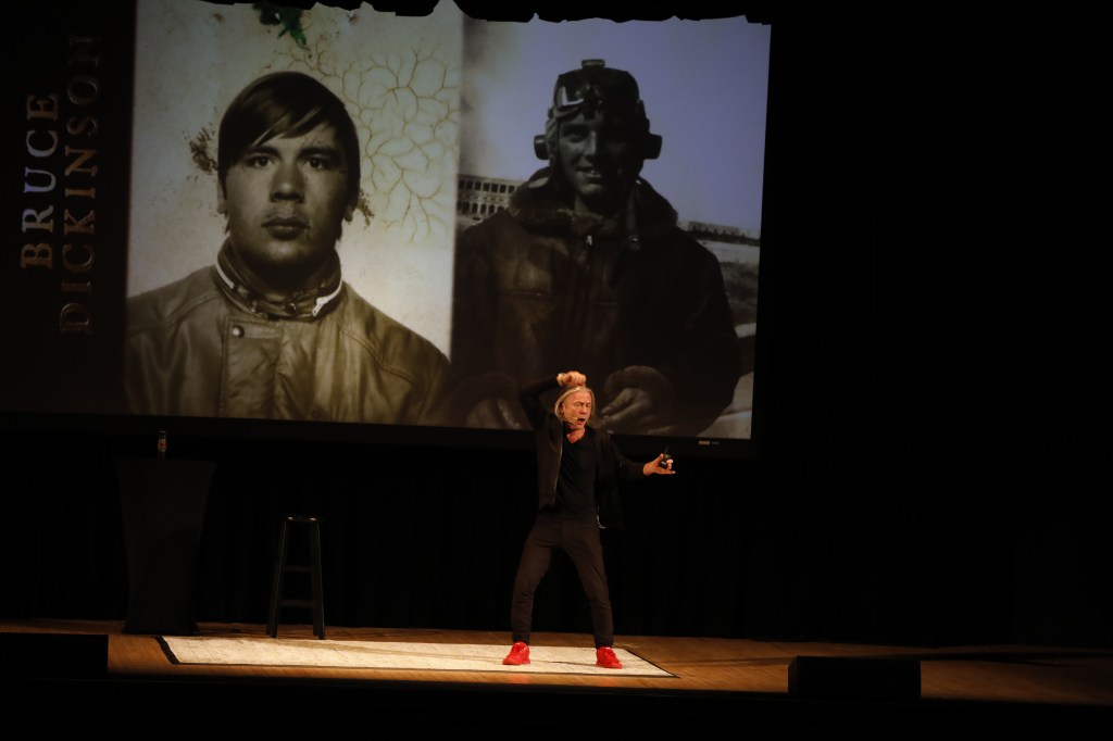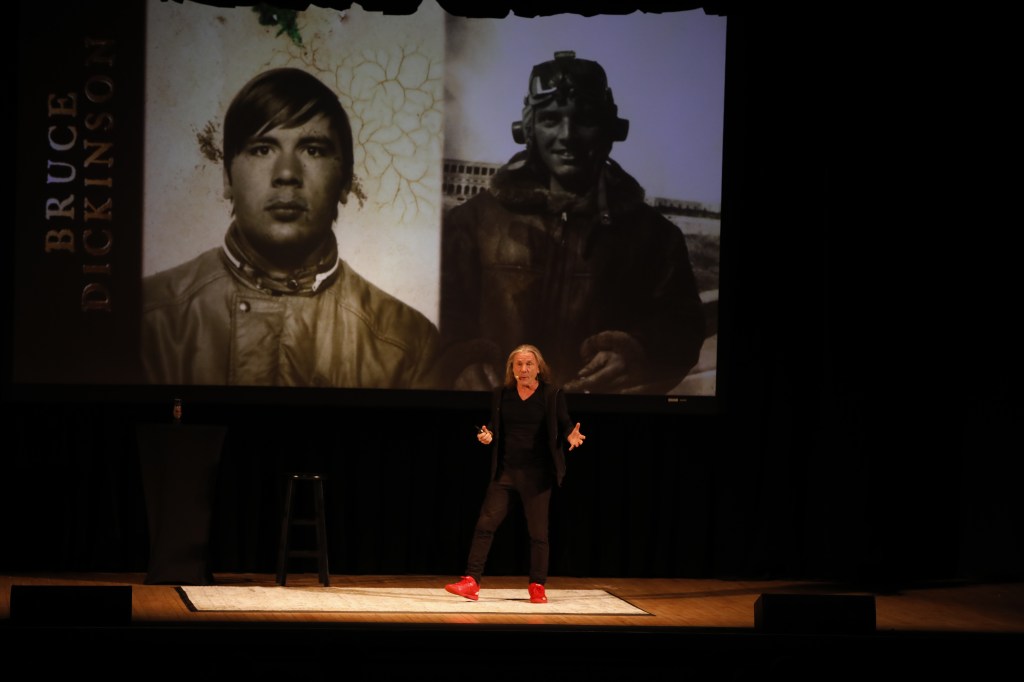 Dickinson ended the first portion with the video for Iron Maiden’s latest single “Writing on the Wall” from their new album Senjutsu. After. After intermission Dickinson returned to take questions on note cards fans wrote during the first half.