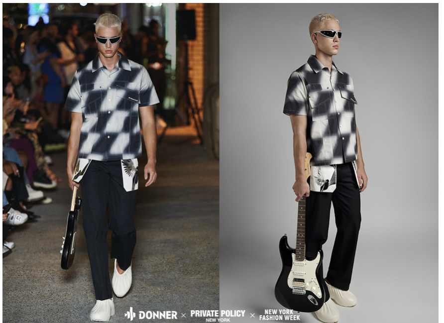 “When we designed the collection, we had the rocker look in mind, effortless and full of attitude, and bringing that free spirit to our interpretation for today,” said Siying Qu of Private Policy. “Therefore, it’s perfect that we can partner with Donner and have not only electric guitars on the runway, but also a full band setup for guests to play. It will be a true music and fashion party.”